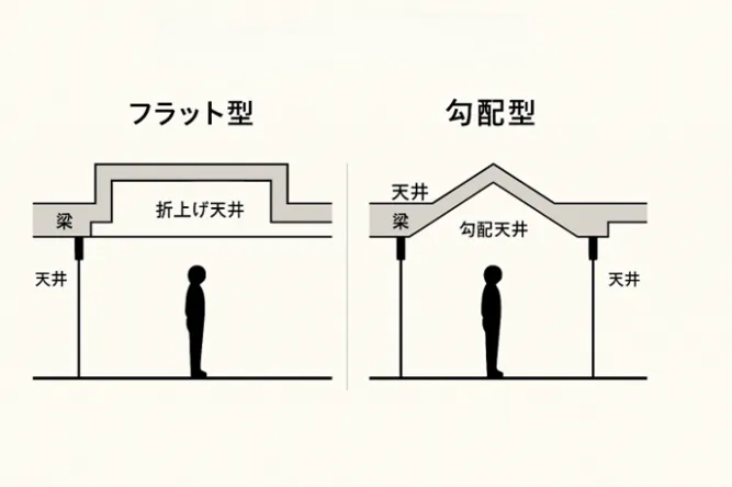 下図は、折上げ天井のフラット型と勾配型の違いを断面で示したものです。